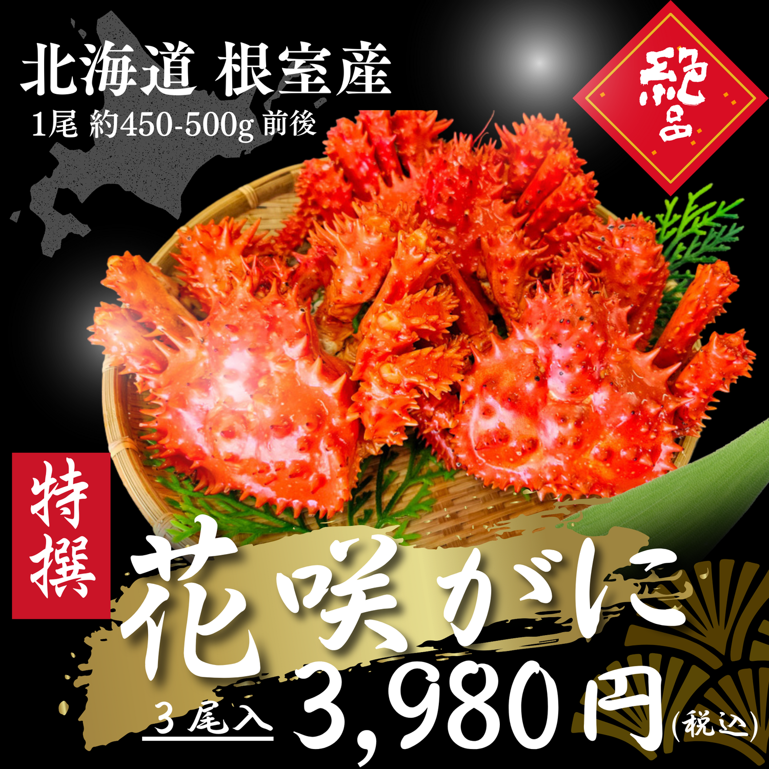 北海道・根室の冷たい海で育った「花咲がに🦀」を厳選して3尾セットにしました👍