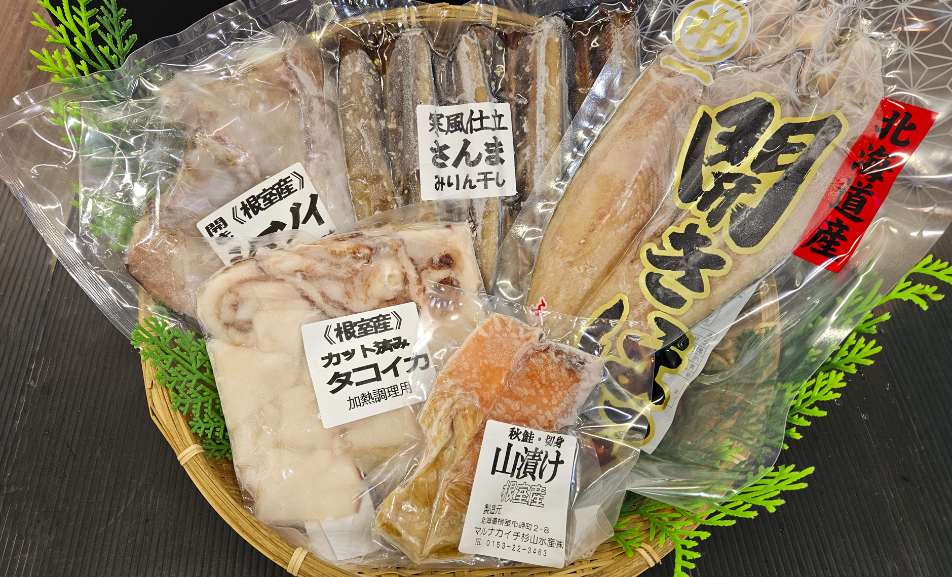 ホッケ開き、シマソイ開き、さんまみりん干し、カットタコイカ、山漬切身──すべて北海道産の自慢の味。